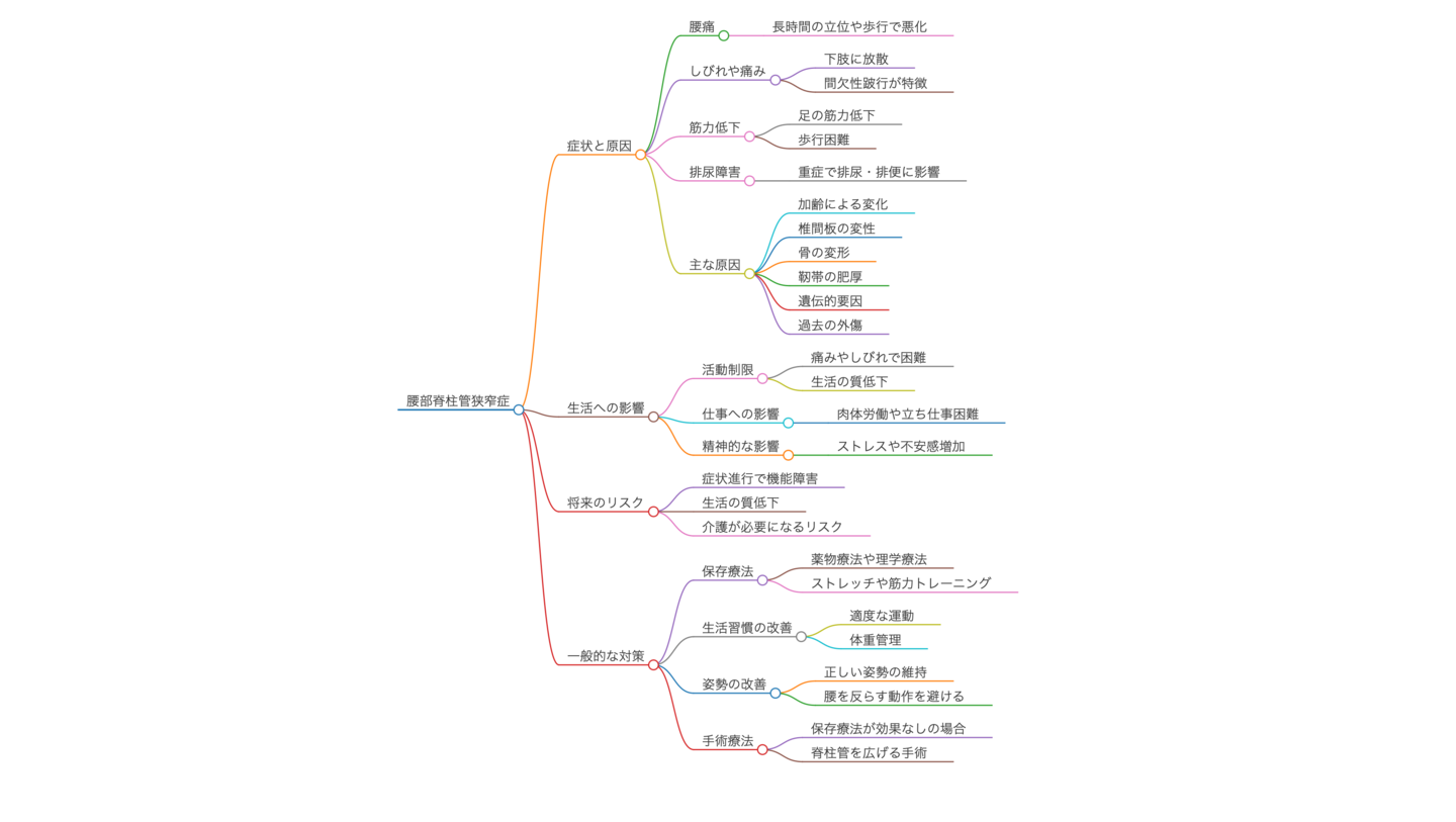 将来的には、症状が進行することで、歩行困難や排尿障害が悪化し、介護が必要になるリスクが高まります。これに対する一般的な対策としては、保存療法が推奨され、痛みを和らげるための薬物療法や理学療法が効果的です。また、生活習慣の改善や姿勢の見直しも重要です。手術療法は、保存療法が効果を示さない場合に検討され、脊柱管を広げることで神経の圧迫を軽減することが目的です。