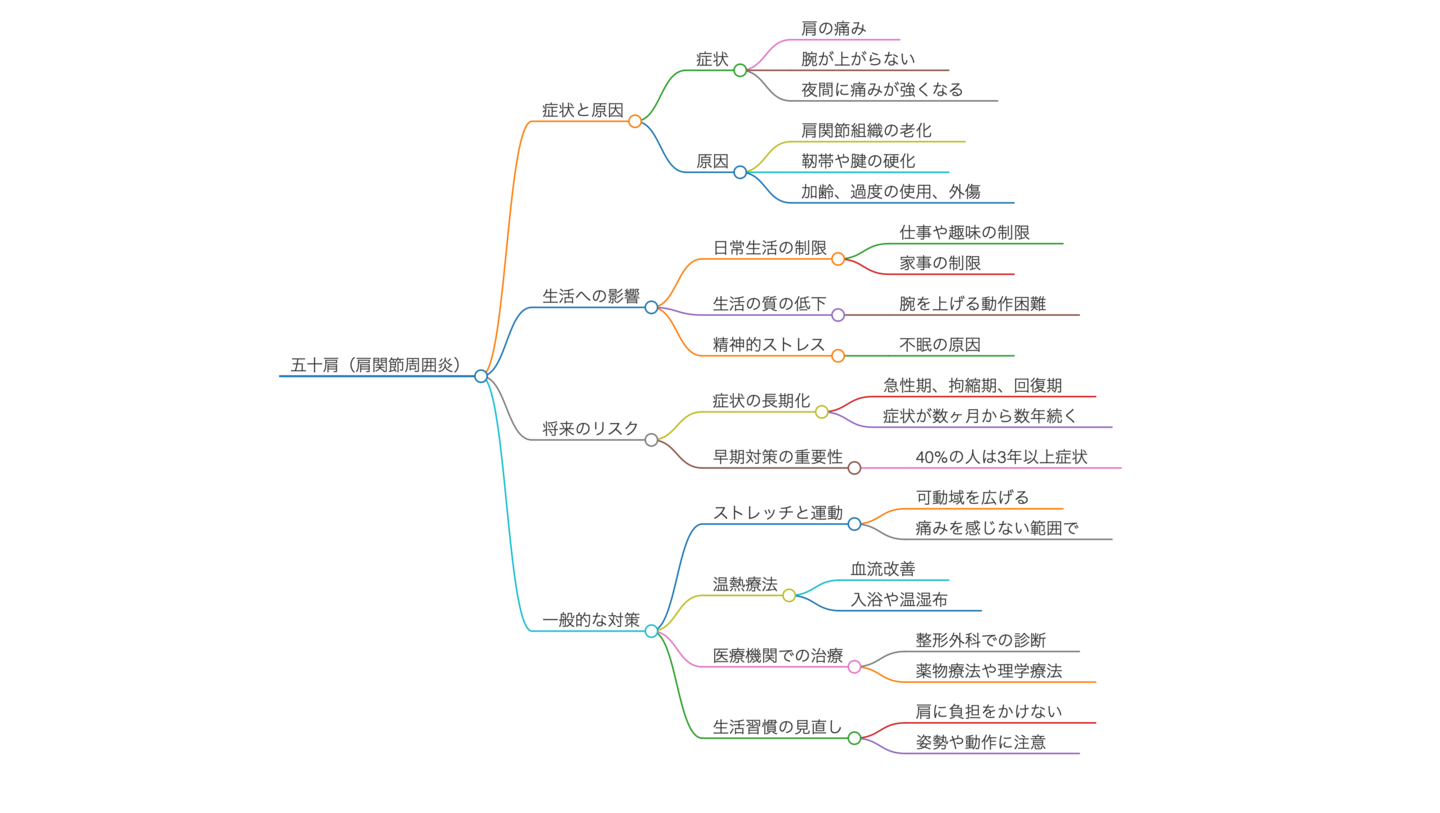 一般的な対策としては、ストレッチや軽い運動、温熱療法、医療機関での治療、生活習慣の見直しが推奨されます。特に、痛みを感じない範囲での運動が重要であり、肩を温めることで血流を改善し、筋肉の緊張を和らげることが期待できます。