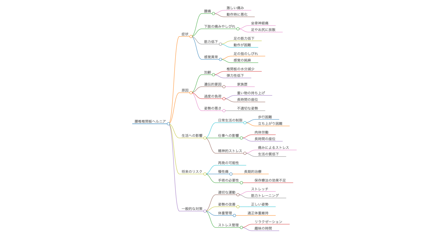 腰椎椎間板ヘルニアの症状や原因に加え、生活への影響や将来のリスク、一般的な対策についてさらに詳しく説明します。