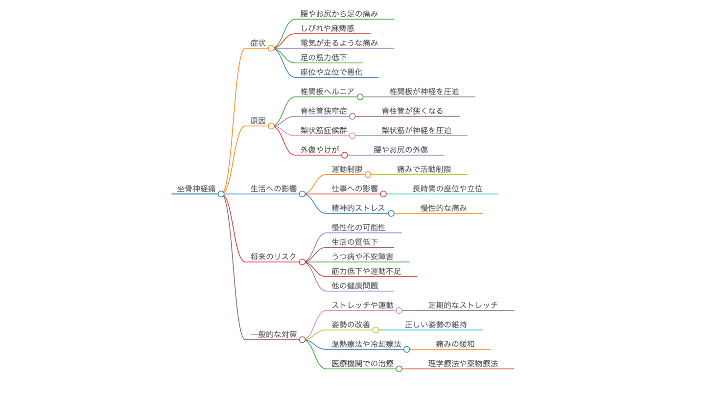 放置すると、坐骨神経痛は慢性化する可能性があります。慢性的な痛みは、生活の質を低下させ、うつ病や不安障害のリスクを高めることがあります。また、筋力低下や運動不足が進行すると、他の健康問題(例:心血管疾患)を引き起こすリスクもあります。