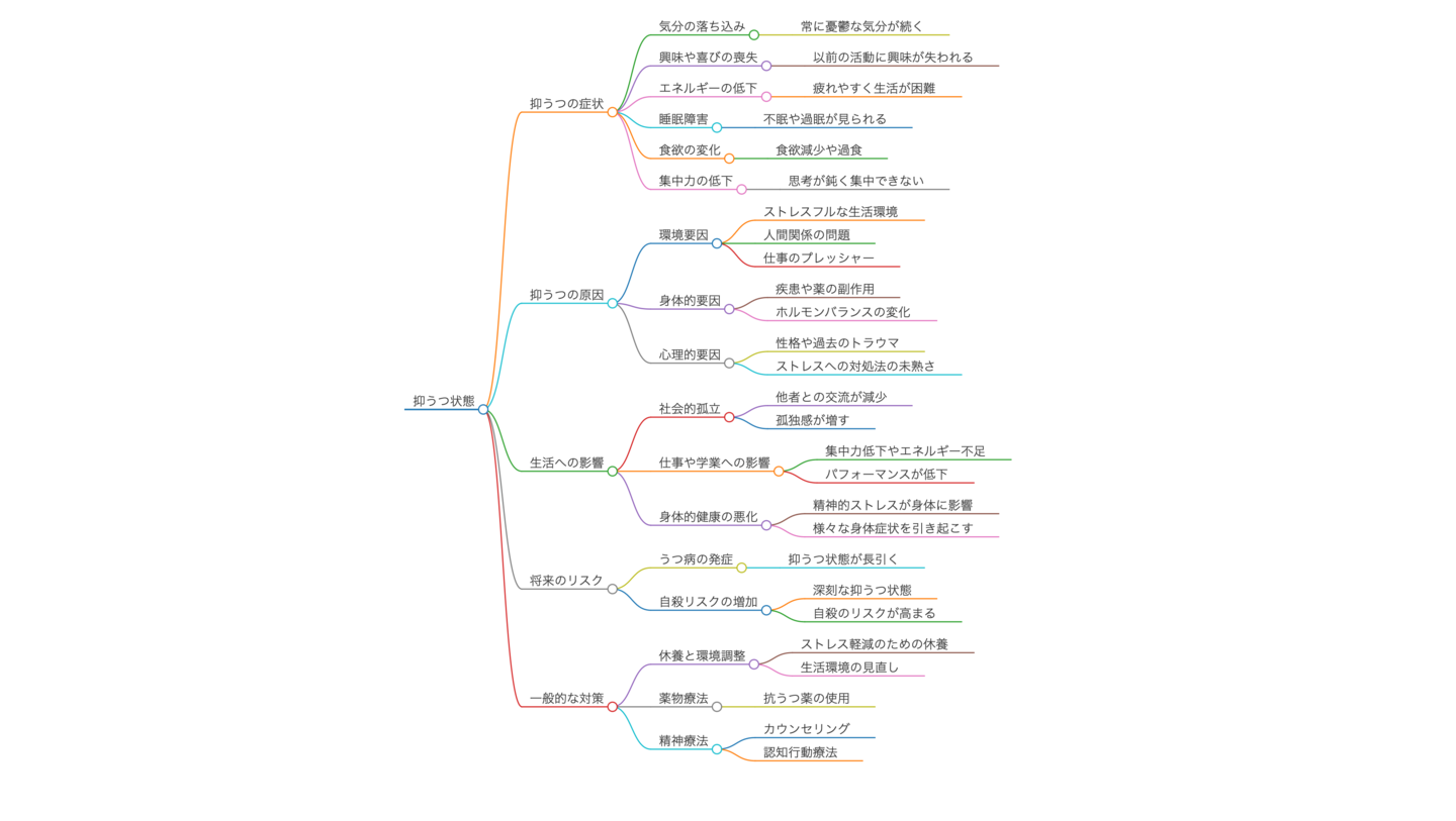 - 自殺のリスク: 重度の抑うつは自殺念慮や自殺行動につながることがあります。